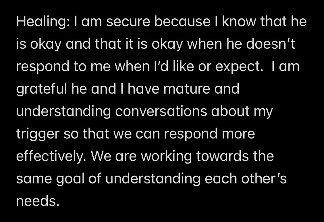I linked this trigger to my abandonment trauma, formed by past experiences of being left behind by my parents or feeling ignored by past romantic partners. I don’t go into detail here because the experiences span many moments over the years. Instead, I analyzed the trigger through a logical approach, explaining why it evoked these feelings.